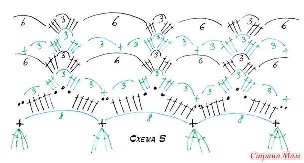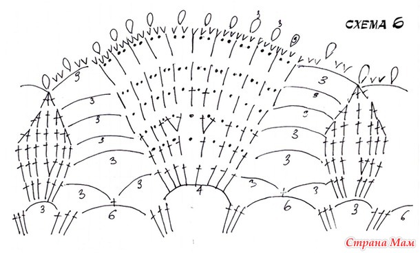 Вязать я начинала с широкой полосы на схеме 2 (далее 3, 4, 5 и только потом от нового клубка я связала часть по схеме 1, соединив её в последнем ряду арок с зубчиками широкой полосы схемы 2). У меня получилась полоса с 39 зубчиками, что соответствует 13 паучкам на схеме 1. Но при вязании нижней части мне пришлось в схеме 3 добавить дополнительную арочку между двумя столбиками с накидом. Благодаря этому у меня получилось 40 листиков схемы 4 и соответственно 20 элементов схемы 6.