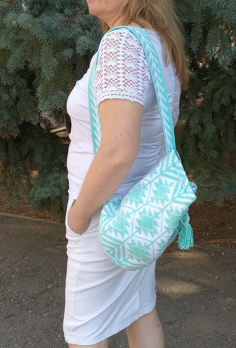 При жаккардовом вязании крючком основная штука в том, что нерабочие нитки потягиваются внутри столбиков без накида. Полотно уплотняется, становится более жестким. Для сумки самое то.