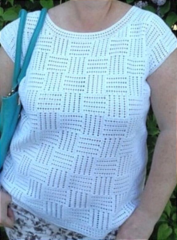 Футболка, в первую очередь, привлекает внимание своей необычной конструкцией, не такой, что вырви глаз, а лаконичной, базовой, подходящей и под джинсы и под юбку. Таким узором можно связать не только футболку, но и платье, главное разобраться в этой хитрой конструкции.