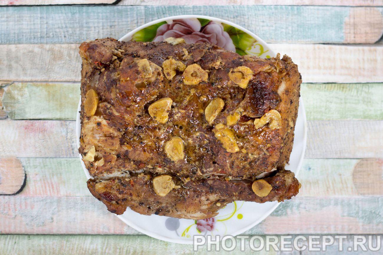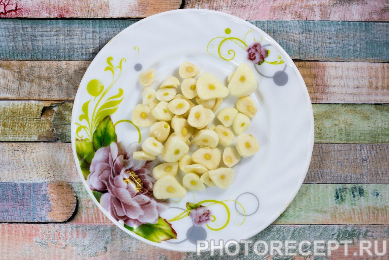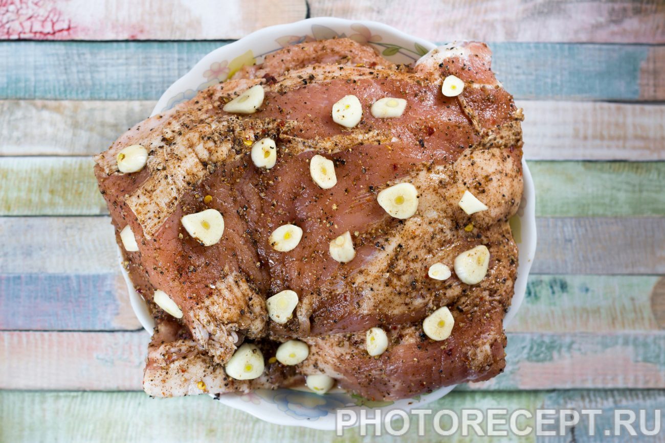 Выбирая свинину для такого блюда, стоит обратить внимание на балык, шею или грудинку. Балык в итоге получается немного суховат, грудинка для любителей жирненького, а вот шея, приготовленная таким способом, будет изумительна. Натрите мясо специями со всех сторон и уложите чеснок. Положите мясо в любую ёмкость с крышкой и поставьте в холодильник на сутки.