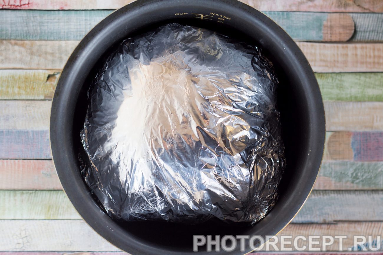 Через 24 часа достаньте мясо из холодильника и очень тщательно заверните его в несколько слоев фольги, не допуская никаких зазоров. Уложите на дно мультиварки пергамент для выпекания, разместите красивый блестящий сверток со свининой и установите режим "Жарка". В моей мультиварке DEX жарка происходит при температуре 130 градусов в течение 45 минут.
