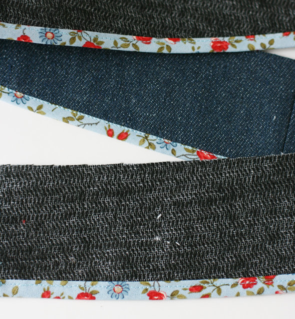 Поперечные срезы бейки всегда стачивают под углом 45 градусов, для уменньшения толщины бейки под лапкой.