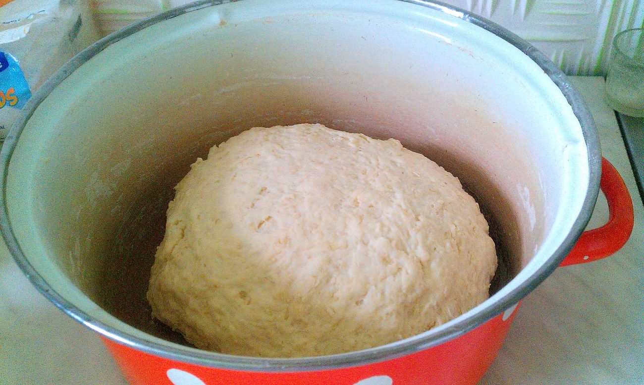 Всё хорошо вымешать и поставить в теплое место для подъема. На пару часов. Обязательно накрыв крышкой емкость с тестом, что бы оно не покрылось сухой корочкой.