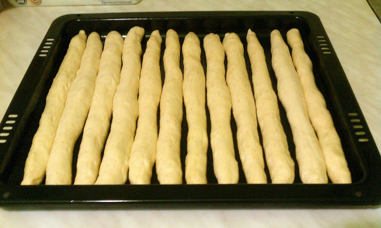 Когда тесто хорошо поднимется, делим его на 12 частей. И раскатываем тонкие колбаски. Выкладываем их на противень смазанный жиром.