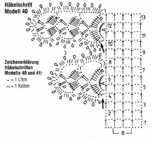 Провязать "туда-сюда" 5 рядов по схеме.  3 воздушные петли, затем   сделать столбик с 7-мью накидами в основание петли 5 ряда (для последующего вывязывания узора боковой части). Связать до конца ряд 6 и ряд 7. Затем обвязать столбик с семью накидами как показано на схеме (а) и вязать по-порядку ряды a-b-c-d, затем от  d по правому краю возвратиться назад, делая 8 воздушных петель, прочный столбик, 8 воздушных петель, прочный столбик. Затем в обратную сторону обвязывать до d. Перейти рачьим шагом и обвязать левую сторону аналогично (переходы делаем с помощью рачьего шага).