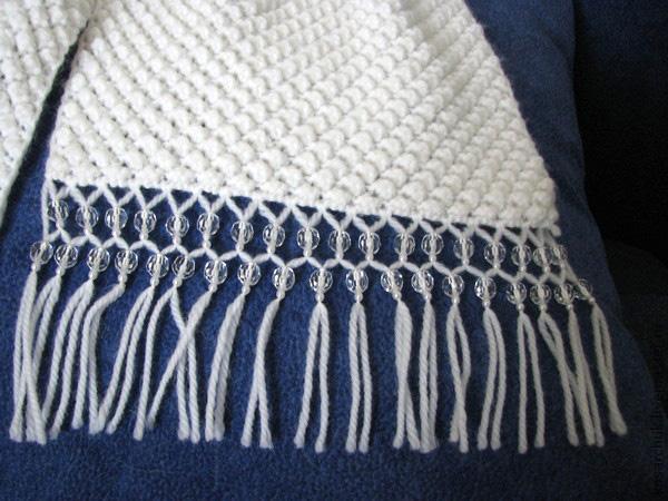 Хочу поделиться своей идейкой по созданию симпатичной бахромы. Мой шарфик был связан спицами узором "Шишечки", но, естественно, это может быть шарфик в любой технике, на бахрому нанизаны крупные прозрачные и маленькие белые бусины. Прозрачные бусины дают очень оригинальный эффект – цвет основной одежды как бы переходит на шарф, поэтому он всегда к месту :)