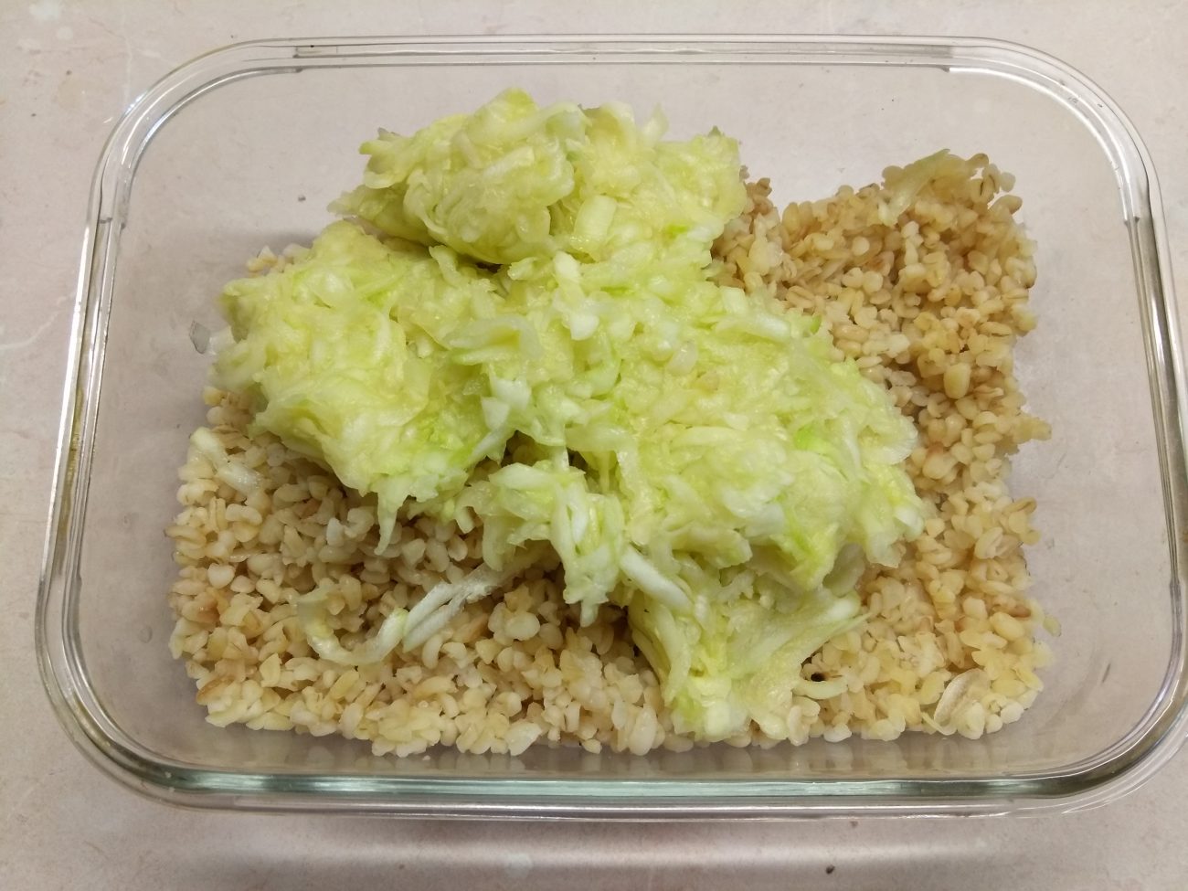 2. Кабачки помыть, натереть на крупной терке, посолить. Дать им пустить сок. Сок хорошо отжать. Добавить кабачки к остывшему булгуру.