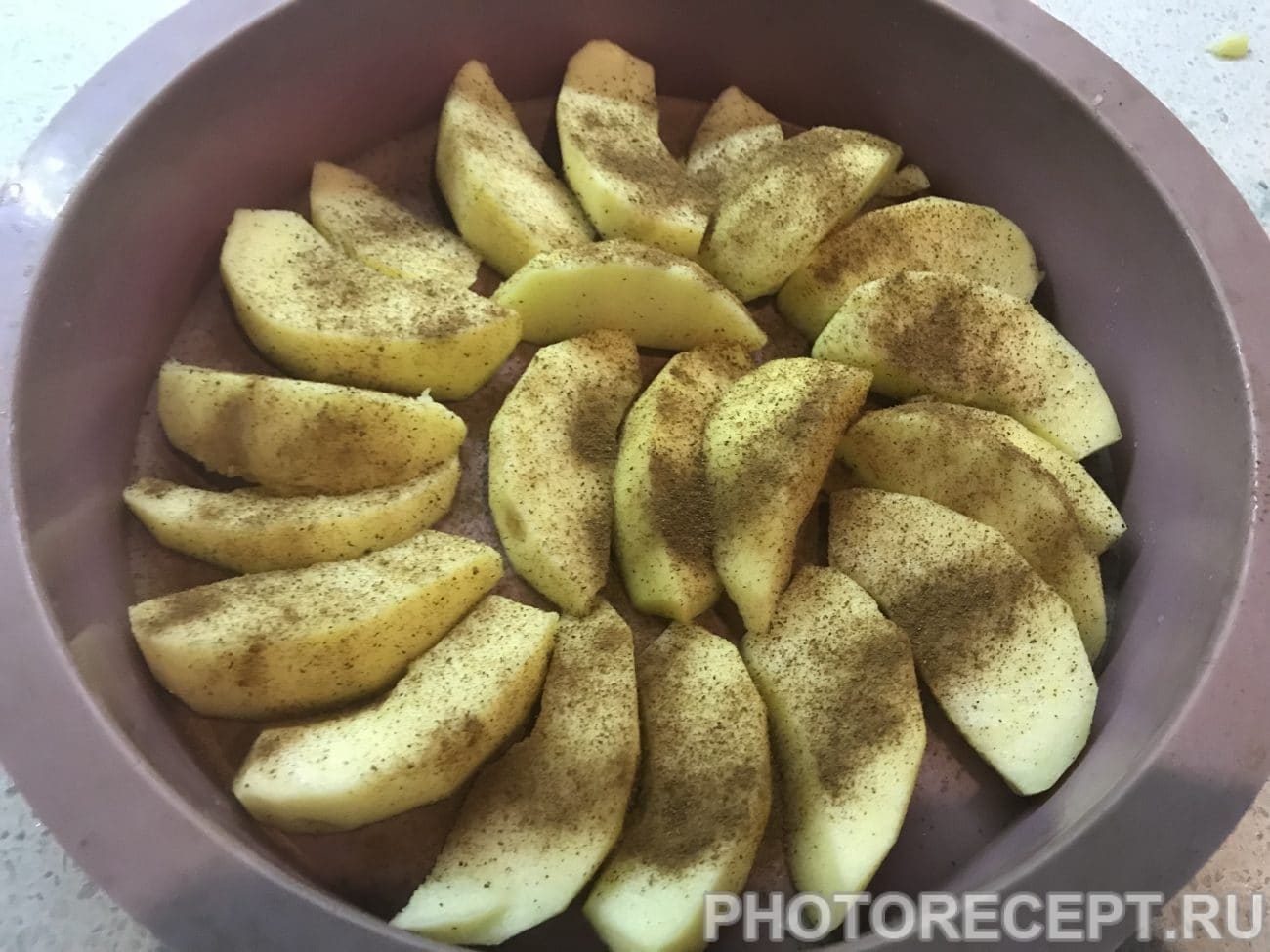 Дальше очищаем яблоки от кожуры, режем на дольки и раскладываем по дну формы. По желанию посыпаем корицей.