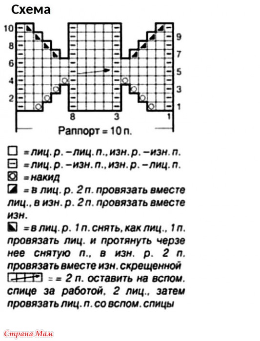 Основной узор (спицы №3,5) вязать по схеме . Петли в лицевых и изнаночных рядах обозначены так, как они выглядят на лицевой стороне работы.
