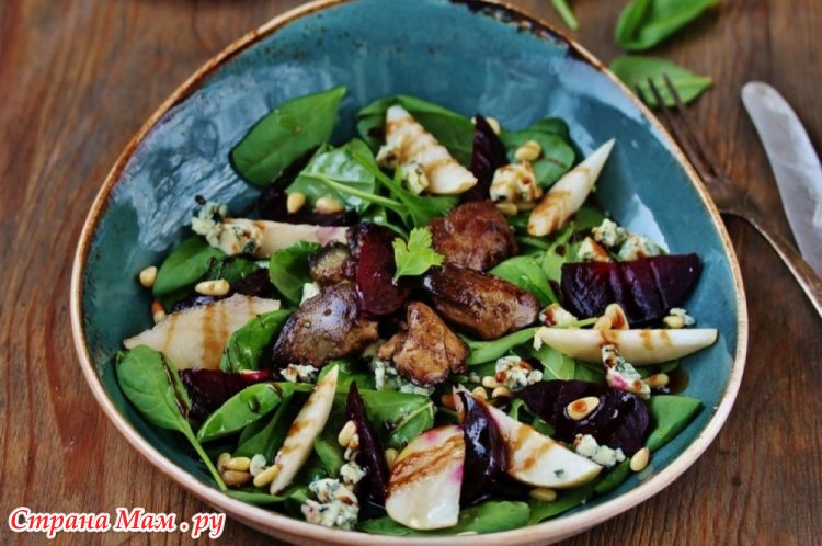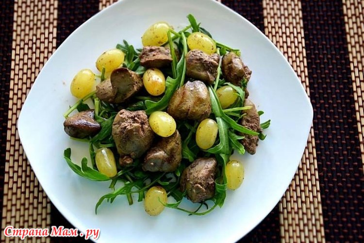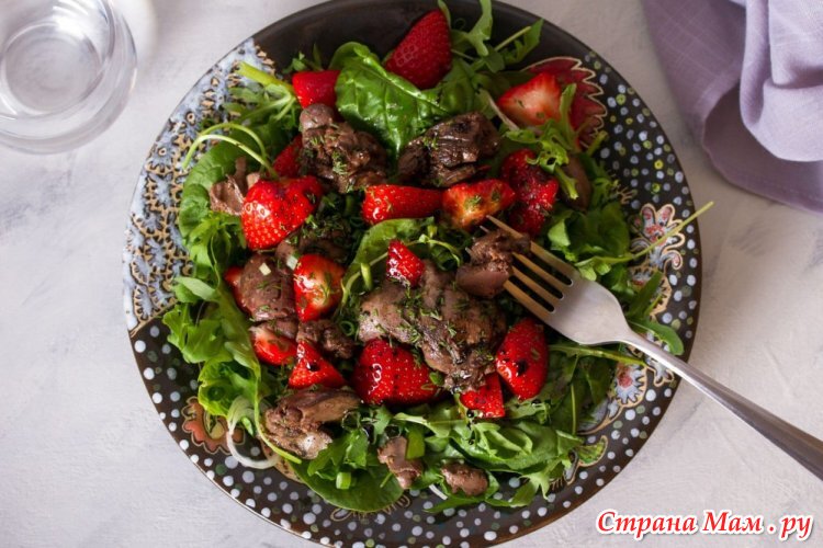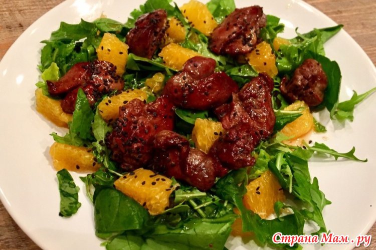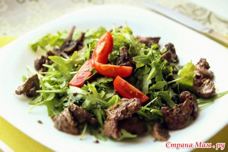 В чем особенность этого салата. Самое сложное тут — это пожарить куриную печень: покупаю охлаждённую, замачиваю в холодной воде с уксусом, чтобы вышла кровь. Достала, порезала на небольшие кусочки, обсушила, обваляла в кукурузной муке или кукурузном крахмале и отжарила до золотистой корочки (это самое вкусное). В салатник накидываем руколлы, выкладываем печень,я люблю много печени.